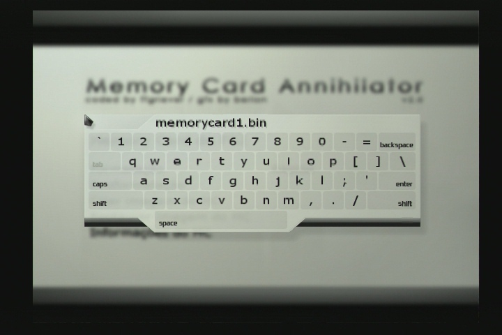 3:) Aqui você esta dentro da sua Mídia USB (PenDrive ou HD Externo), agora escolha um local (dentro da sua Mídia USB) onde o Memory Card Annihilator vai fazer a copia do seu Memory Card e aperte o botão “START” do controle, na janela seguinte vai aparecer um teclado, neste teclado você pode mudar o nome do arquivo que vai ser criado (não apague a extensão do arquivo), independente de você ter mudado o nome do arquivo ou não aperte o batão “START” do controle novamente para prosseguir.