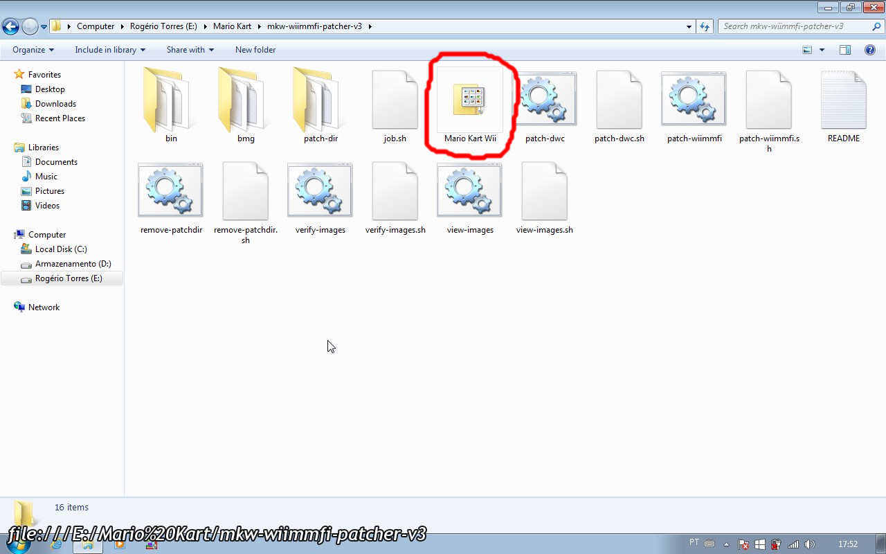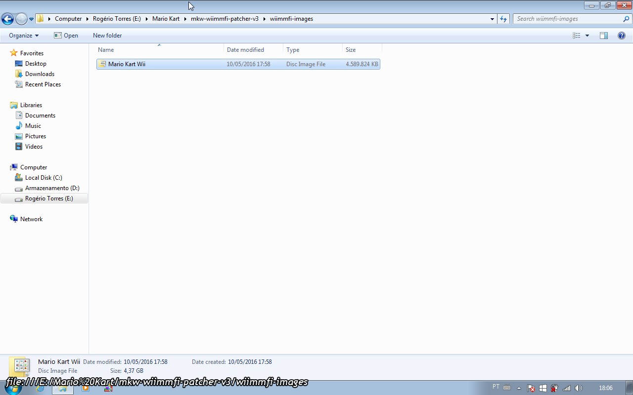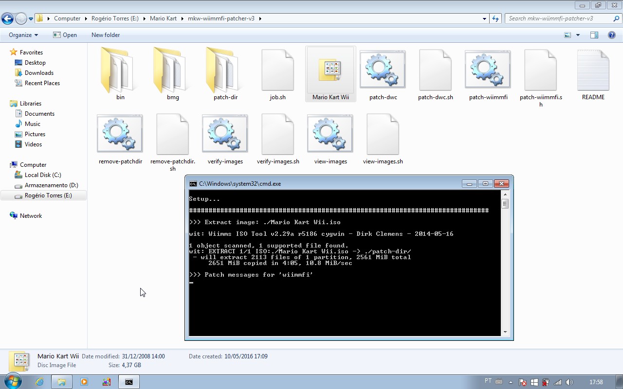2:) Arraste o jogo “Mario Kart Wii” (tanto faz o formato que você escolheu ISO ou WBFS) para cima do arquivo de nome “patch-wiimmfi.bat”.