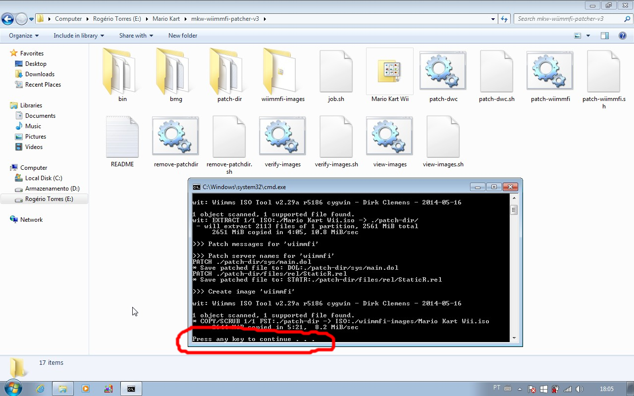 4:) Se o procedimento terminar corretamente vai aparecer a seguinte mensagem “Press any key to continue …”, aperte “Enter” para terminar o processo de CMD e a aplicação do patch Wiimmfi.