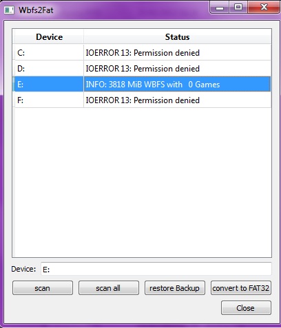 1º passo – Conecte seu hd ou pen drive que está em WBFS no seu computador e execute o programa wbfs2fat, e clique em “SCAN ALL”, teremos a seguinte tela:
