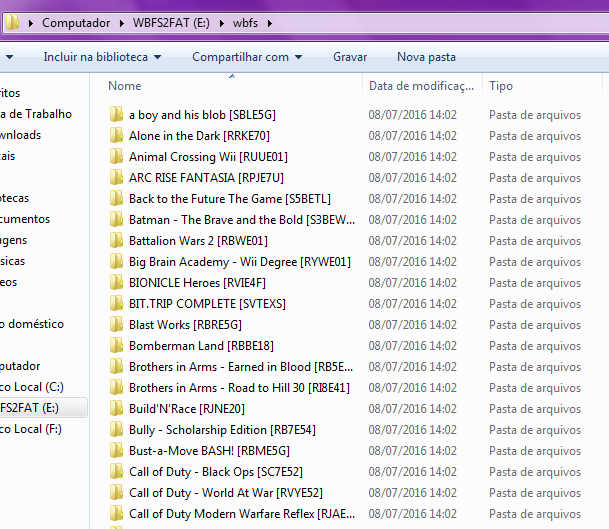A pasta “WBFS” com os jogos todos organizados pelo programa wbfs2fat após a conversão: