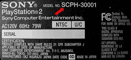DICA: O modelo do seu Playstation 2 fica na parte de baixo do console (ou no fundo) dependendo do modelo, em uma etiqueta como mostra na imagem abaixo: