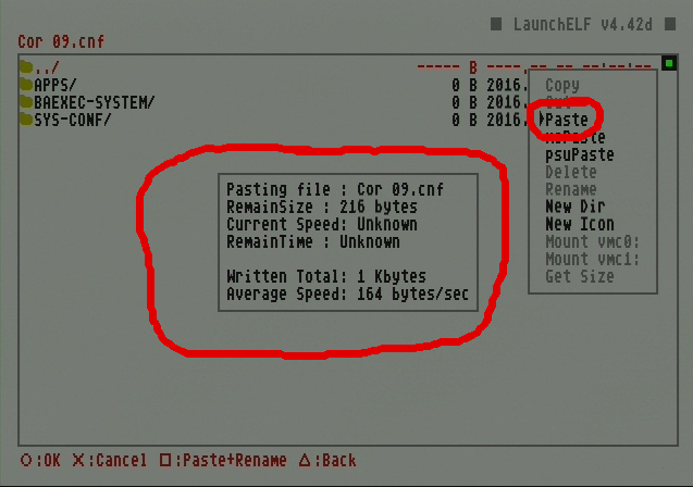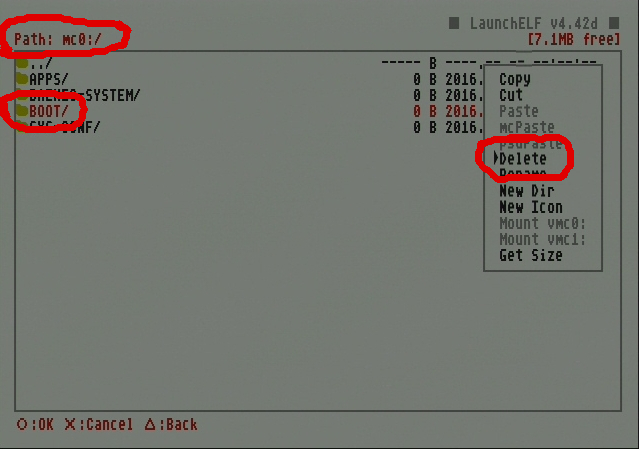 Dentro Memory Card (“mc0:/”) navegue até a pasta “BOOT” e aperte o botão “R1” do seu controle para aparecer um menu de opções, neste menu escolha a opção “Delete” e aperte o botão “O” do controle, espere um momento para o ULaunchELF deletar esta pasta (Se o seu Playstation 2 não foi compatível com o Free Memory Card Boot naturalmente não vai ter nenhuma pasta chamada “BOOT”), após a pasta “BOOT” ser deletada aperte novamente o botão “R1” do seu controle para aparecer o menu de opções, no menu de opções escolha a opção “Paste” (Segunda opção) e aperte o botão “O” do controle, espere um momento para que esta operação seja concluída, pode demorar um pouco.