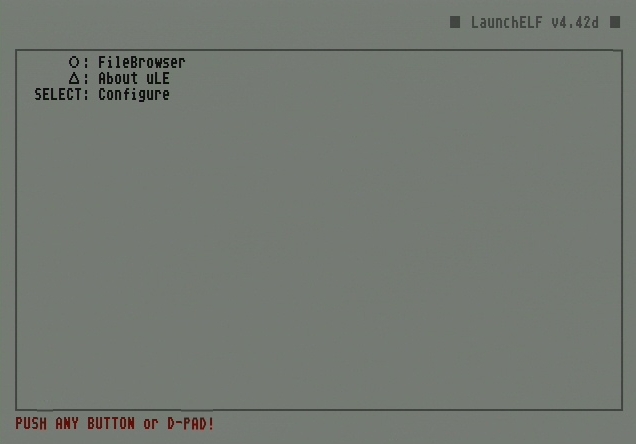 Tire os Memory Card do seu Playstation 2, ligue o console e Insira o CD ou DVD do ULaunchELF CD que você gravou (lembrando que você terá que usar um Playstation 2 com canhão funcionando), o console deverá estar sem Mídia USB (Pendrive ou HD Externo), ligue o Playstation 2 e espere o UlaunchELF CD abrir: