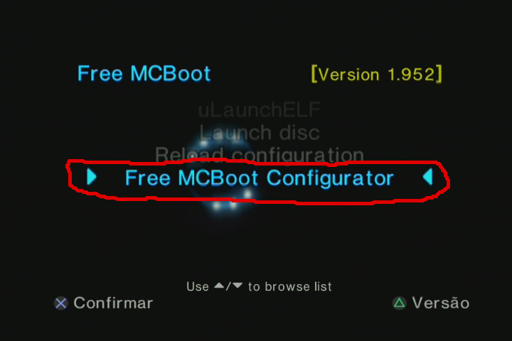 Ligue o seu Playstation 2 com o Memory Card Memory Card na primeira entrada (Slot) de Memory Card do seu Playstation 2 e não aperte nada no seu controle, vai iniciar o Free Memory Card Boot, após iniciar vá até a opção “Free MCBoot Configurator” (ultima opção no menu) e aperte o botão “X” do seu controle: