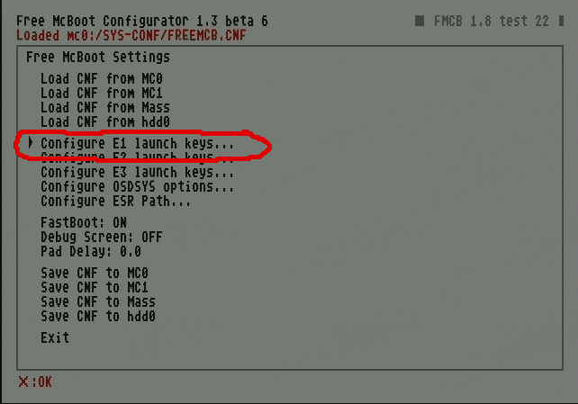 Agora estamos dentro do “Free MCBoot Configurator”, navegue até a opção “Configure E1 launch keys …” e entre nela apertando o botão “O” do controle: