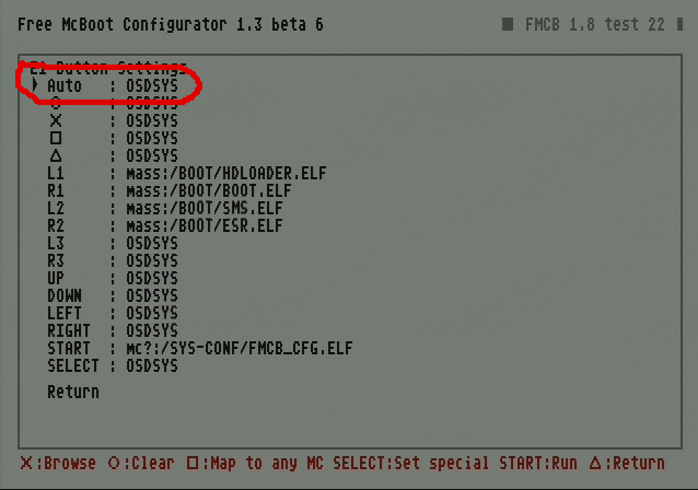 Na tela que a imagem abaixo mostra entre na opção “AUTO : OSDSYS” (primeira opção) apertando o botão “O” do controle: