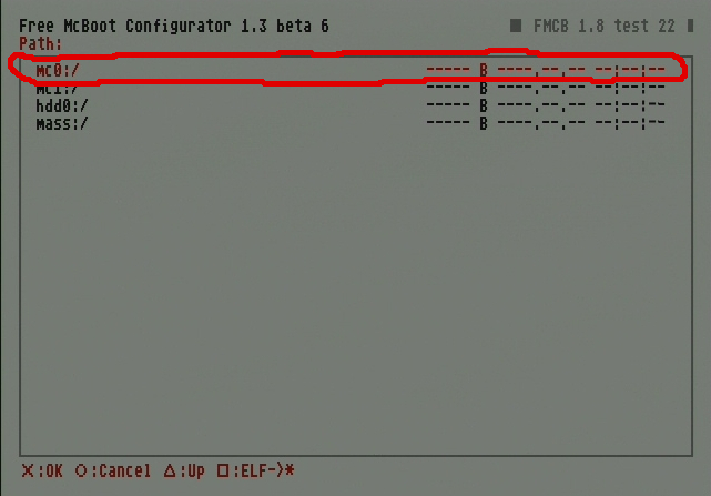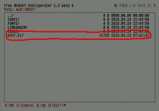 Dentro da pasta “BOOT/” navegue até o arquivo “BOOT.ELF” (caso você tenha optado por instalar somente o Open PS2 Loader o procedimento aqui é o mesmo) e aperte o botão “O” do controle: