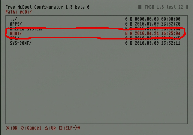 No seu Memory Card entre na pasta “BOOT/” com o botão “O” do controle: