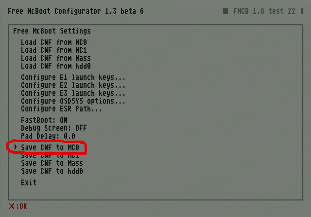 Talvez você tenha percebido que voltamos para a tela inicial de configurações do “Free MCBoot Configurator”, aqui você vai navegar até “Save CNF to MC0” e apertar o botão “O” do controle para gravar (salvar) as configurações feitas no Free Memory Card Boot: