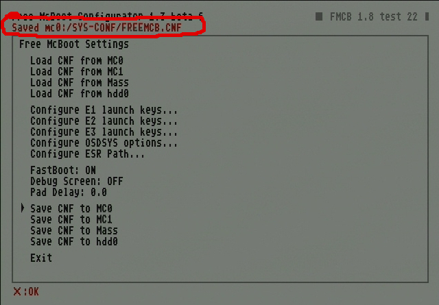 Se as configurações foram salvas corretamente vai aparecer a seguinte mensagem “Saved MC0:/SYS-CONF/FREEMCB.CNF” no canto superior esquerdo da sua televisão: