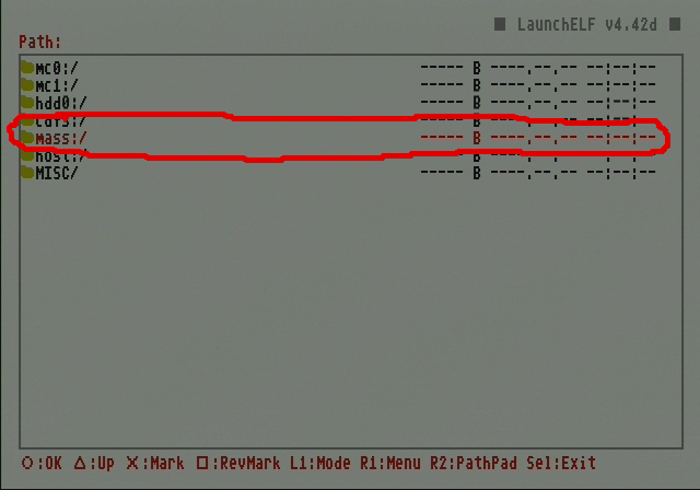 Para aqueles que o modelo de Playstation 2 não foi compatível com o Free Memory Card Boot insira o seu Memory Card na primeira entrada (Slot) de Memory Card do seu Playstation 2, agora Independente do seu Playstation 2 ter aceitado a instalação do Free Memory Card Boot ou não aceito coloque a Mídia USB (PenDrive ou HD Externo) já formatada em FAT32 e com o “PS2OS Lite” dentro, na primeira entrada USB do seu Playstation 2 (tem que ser OBRIGATORIAMENTE na primeira entrada USB). No UlaunchELF e dentro de “FileBrowser” entre na opção “MASS:/” apertando o botão “O” (bolinha) do controle: