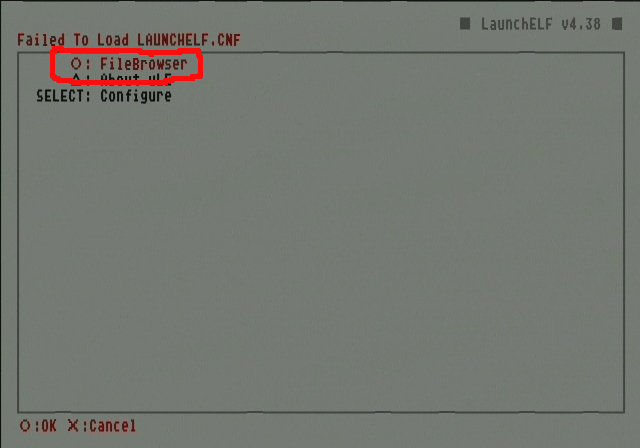 Com o UlaunchELF CD (ou o UlaunchELF do Free Memory Card Boot) aberto escolha a opção “FileBrowser” e aperte o botão “O” (Bolinha) do controle: