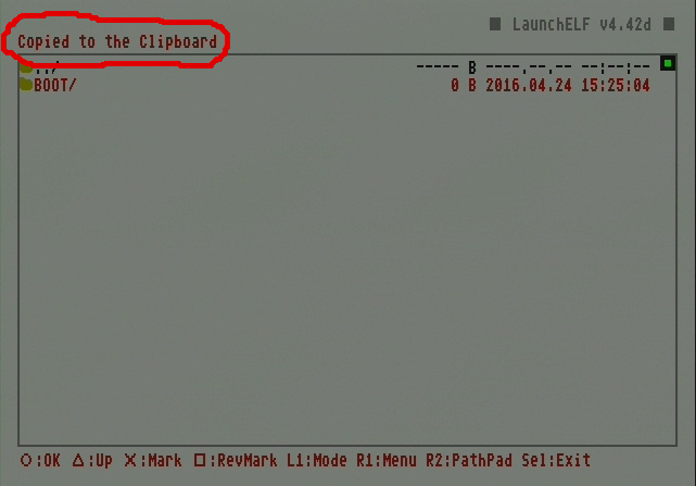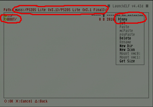 Agora você acessou sua Mídia USB (Pendrive ou HD Externo) através do seu Playstation 2, navegue e entre na pasta do “PS2OS Lite (v3.1)” (ou a pasta “BOOT” com o Open PS2 Loader renomeado para “BOOT.ELF”) com o botão “O” do seu controle (quando você for fazer este tutoriais pode não ser mais a versão 3.1 do aplicativo “PS2OS Lite”), depois escolha a opção “PS2OS Lite (v3.1 Final)” e acesse a pasta com o botão “O” do seu controle (no caso do Open PS2 Loader não precisa acessar por que já estamos na pasta “BOOT”), no monitor da sua televisão você estará visualizando uma pasta chamada “BOOT”, agora navegue até a pasta “BOOT” e selecione ela apertando o botão “X” do seu controle (quando você selecionar a pasta “BOOT” vai aparecer uma bolinha nela), após selecionar a pasta “BOOT” aperte o botão “R1” do seu controle para aparecer um menu de opções, no menu de opções escolha a opção “Copy” (primeira opção) e aperte o botão “O” do controle, vai aparecer a seguinte mensagem na parte superior da tela da sua televisão “Copie to the Clipboard” confirmando que você copiou.