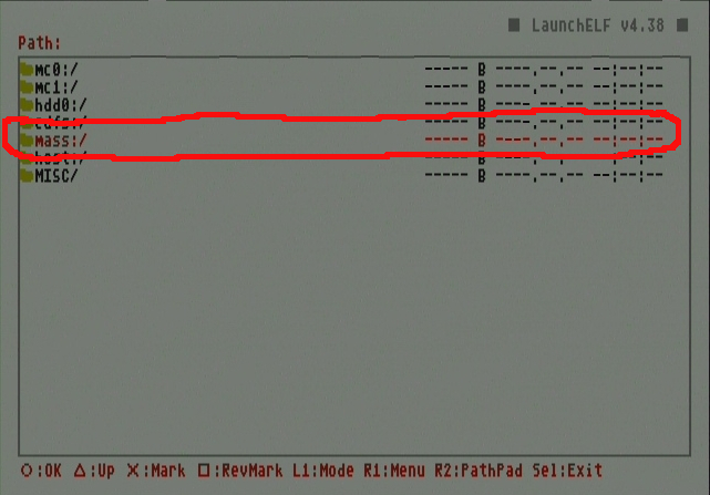 Agora coloque o seu Memory Card na primeira entrada (Slot) de Memory Card do seu Playstation 2, coloque também a Mídia USB (PenDrive ou HD Externo) já formatada em FAT32 e com a pasta contendo o “Free Memory Card Boot” na primeira entrada USB do seu Playstation 2 (tem que ser OBRIGATORIAMENTE na primeira entrada USB). No UlaunchELF e dentro de “FileBrowser” entre na opção “MASS:/” apertando o botão “O” do controle: