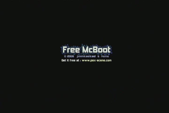 Agora se você deu sorte e o seu Playstation 2 foi compatível com o Free Memory Card Boot, naturalmente você concluiu a “PARTE UM” deste tutorial, faça um teste simṕles para que você tenha certeza de que o Free Memory Card Boot esta instalado e iniciando corretamente no seu console, insira o Memory Card na primeira entrada (Slot) e e inicie seu Playstation 2, ao iniciar obrigatoriamente irá aparecer uma imagem com o logo “Free McBoot” (igual a da imagem abaixo).