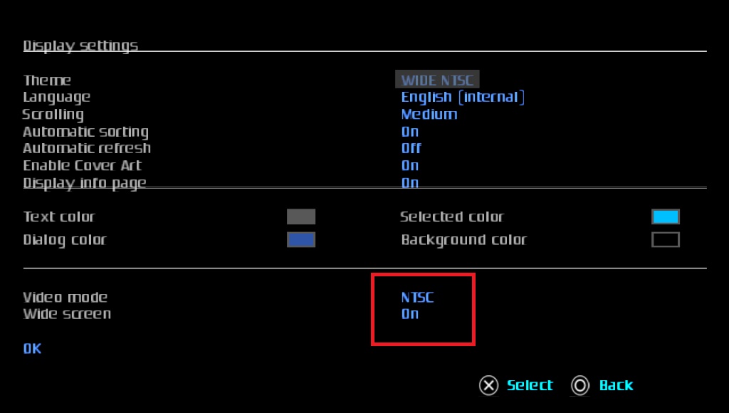 Exemplo: Escolhi uma versão NTSC com Wide Screen, então eu deixarei a opção Video Mode em NTSC e a opção de Widescreen em ON.
