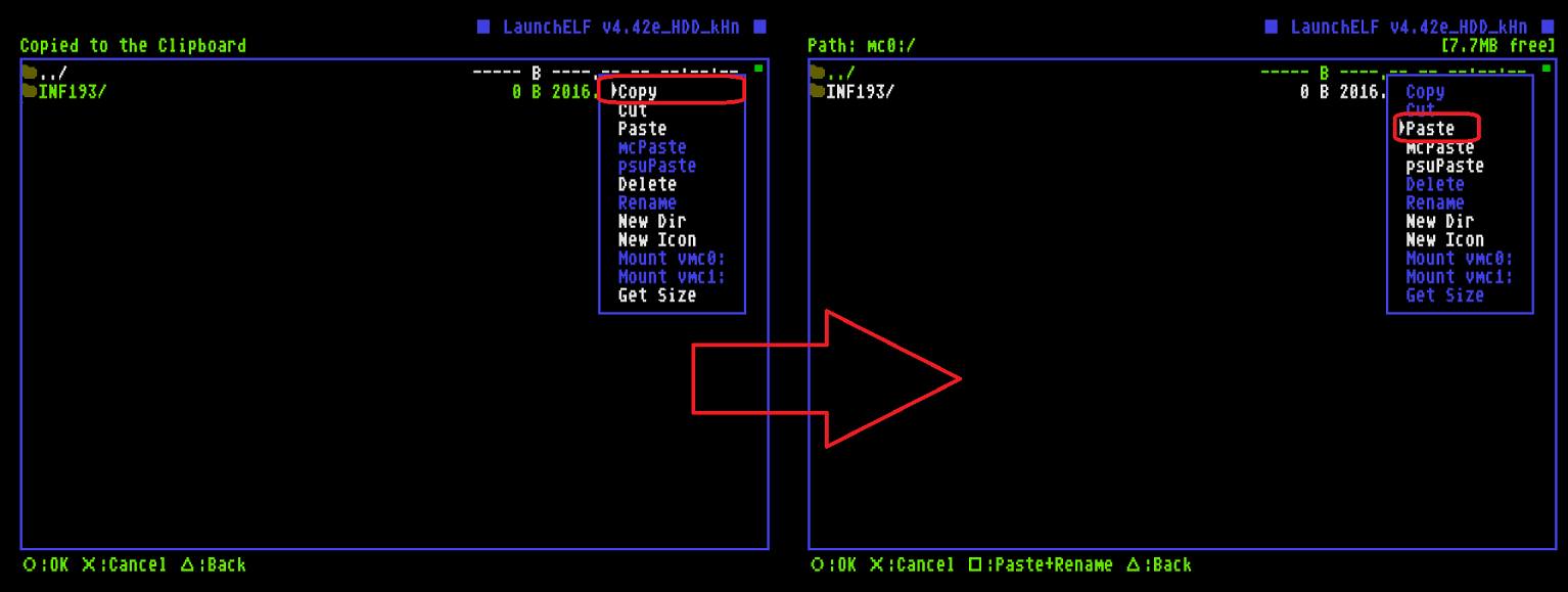 3) No Playstation2, inicie o UlaucherElf, e copie a pasta (INF193) para o MC, é importante que os dois arquivos estejam juntos na mesma pasta (mc0:\INF193)