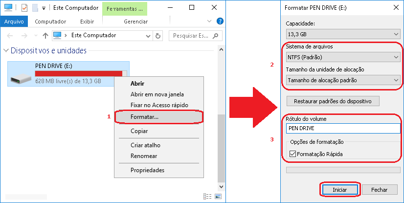 1° Primeiramente você vai preparar o seu dispositivo USB com os jogos de Playstation 2. Como mostrado na imagem abaixo, no Windows vá para  “Meu Computador” e clique com o botão direito do mouse em cima do se dispositivo USB, em seguida clique em Formatar, formate o Pen Drive ou HD Externo em “NTFS” e na hora de formatar coloque um Rótulo (nome da unidade USB),  no meu caso coloquei PEN DRIVE para ficar mais fácil de identificar o dispositivo USB, faça isso por que vai ajudar na identificação do mesmo mais a frente. NOTA: O Dispositivo em FAT 32 funciona porém aqui tive alguns problemas, não consegui de maneira alguma salvar as configurações de cada jogo,  como por exemplo configurações do GSM, VMC (Memory Card Virtual) e etc… Então para que tudo funcione corretamente sugiro que use NTFS, até por que já que está usando a rede ficará livre da limitação de 4 GB e fragmentação da partição.