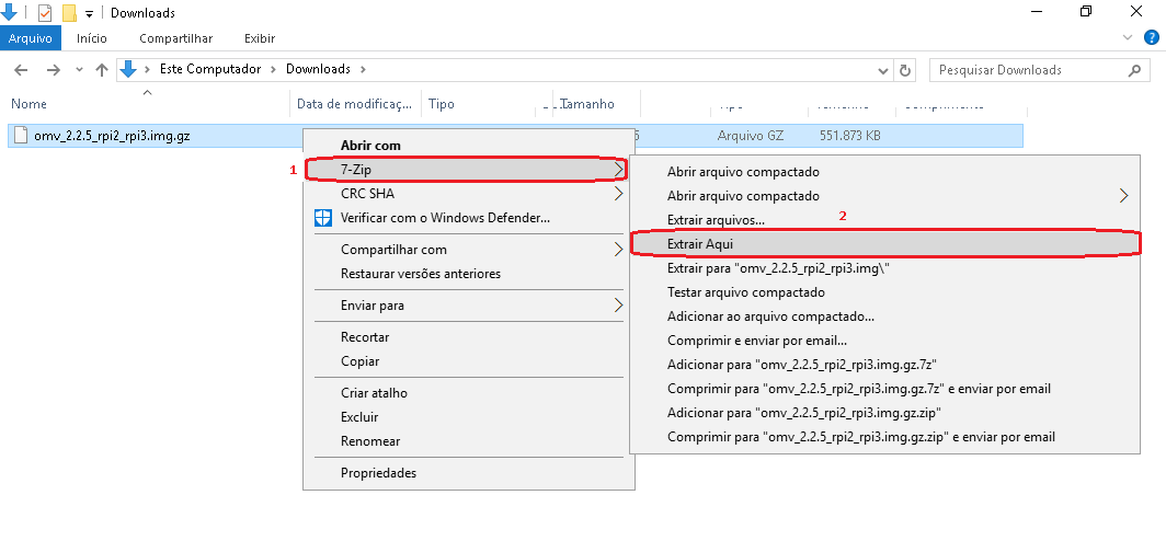 – Clique AQUI para baixar a Imagem do OpenMediaVault para o Raspberry Pi 3 Model B (caso não tenha baixado ainda), em seguida vá para a pasta na qual baixou a imagem e verá que está no formato de compactação .GZ, o que faremos agora é instalar o programa 7zip, para descompactar o arquivo no formato .GZ, siga os passos mostrado na imagem abaixo, clique com o botão direito do mouse em cima do arquivo compactado, clique em 7-Zip e em seguida na opção Extrair Aqui: