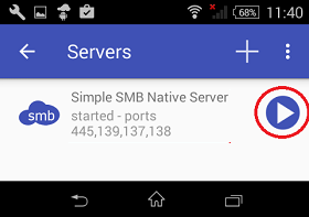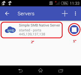 Em SMB Native Severs salve novamente e volte para a tela Servers, como mostrado na imagem abaixo, clique no circulo azul para iniciar o nosso Servidor SMB configurado. Lembra do seu  IP? caso não tenha anotado clique em cima do Servidor e em info poderá vê-lo novamente: