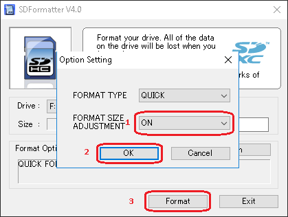 Na janela que se abriu vá para a opção FORMAT SIZE ADJUSTMENT e escolha a opção ON, de um OK e em seguida clique em Format para formatar o Cartão SD: