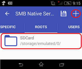 Em SMB Native Server clique na aba ROOTS e como mostrado na imagem abaixo clique na pasta, caso não exista uma pasta clique no Símbolo de + para criar uma: