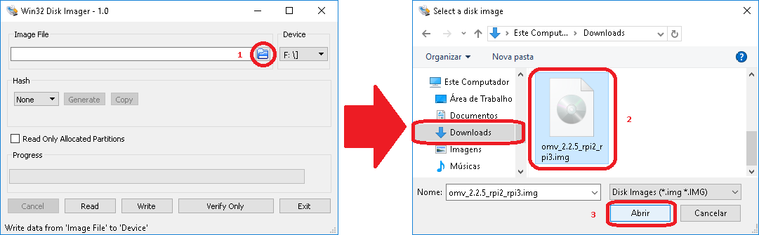 – Com o Cartão SD devidamente formatado, instale agora o programa Win32DiskImager, para poder passar a imagem do OpenMediaVault (OMV) para o Cartão SD, depois de instalado o programa Win32Diskimager no Windows, abra-o, e em seguida conforme mostrado na imagem abaixo, vá para a opção Imagem File e clique no ícone de uma Pasta Azul em seguida procure a imagem do OpenMediaVault que extraiu anteriormente de nome “omv_2.2.5_rpi2_rpi3.img” e clique em abrir: