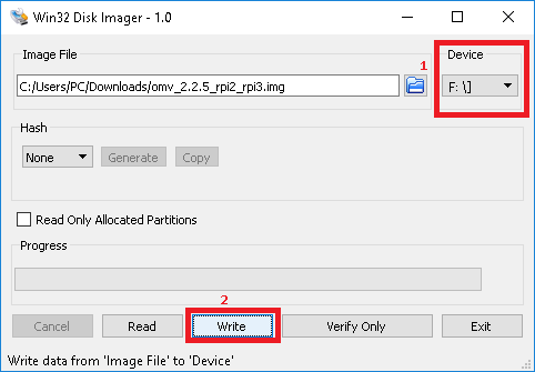 Após abrir a imagem do OpenMediaVault deixe tudo conforme ilustrado na imagem abaixo, escolha a letra em que o seu Cartão SD está montado, no meu caso está na letra F e em seguida clique na opção Whrite, feito isso aguarde até o Win32Diskimager copiar toda a imagem para o seu Cartão SD.