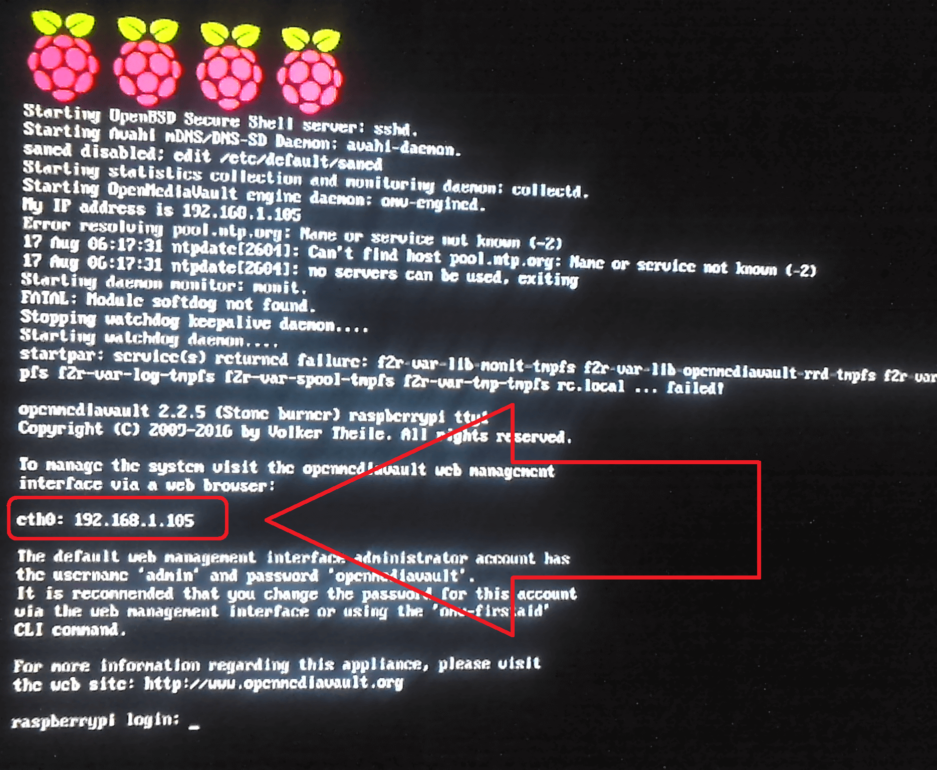 – Com a imagem do OpenMediaVault no Cartão SD, conecte o Cartão SD, Pen Drive ou HD Externo no seu Raspberry Pi 3 Model B, em seguida conecte um cabo de Rede no Raspberry Pi 3 Model B e no seu Roteador, se por um acaso não tiver um roteador pode conectar o cabo direto na entrada de Rede do seu computador, lembrando que todo o processo foi testado no Windows 10, mas acredito que funcione em outras versões do Windows. Com tudo devidamente conectado, ligue  o seu Raspberry PI 3 Model B e em seguida aguarde até ele parar na tela mostrada na imagem abaixo, pegue o IP do Raspberry Pi 3 Model B e vá  para o computador :