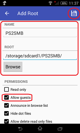 Como mostrado na imagem abaixo,  primeiro vá em Name e coloque PS2SMB, em ROOT clique em Browser e procure o caminho no qual se encontra a nossa pasta PS2SMB, aquela  que você criou bem no começo desse Método 2 e em seguida marque a opção Allow guests, caso a mesma já não esteja marcada, feito isso clique no ícone de Disquete lá em cima para salvar as alterações.