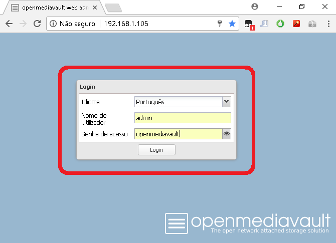 Feito isso estará na página de acesso ao OpenMediaVault, coloque todas as informações conforme mostrado na imagem abaixo e clique em Login para entrar: