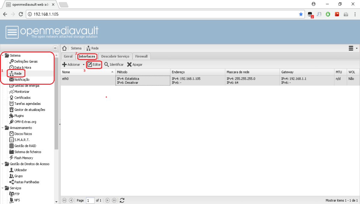 Com a página do OpenMediaVault aberta, assim como mostrado na imagem abaixo no canto superior esquerdo em Sistema clique em Rede e  em seguida a direita clique na aba Interface e abaixo clique em Editar: