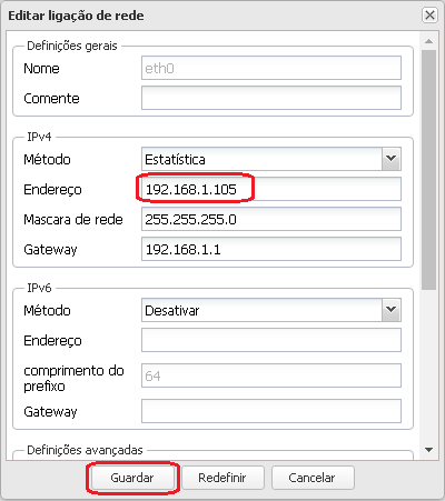 Na janela que se abrirá coloque todas as informações conforme mostrado na imagem abaixo, exceto o IP que tem que ser o seu, em seguida clique em guardar:
