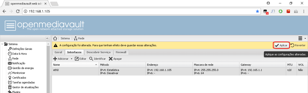 Após ter guardado as configurações aparecerá uma mensagem pedindo para guardar as alterações, clique em aplicar assim como mostrado na imagem abaixo, e em seguida confirme, atenção faça isso a cada alteração, sempre que aparecer essa mensagem com a barra amarela de fundo, clique em aplicar, caso tenha feito algo de errado é só apertar em reverter: