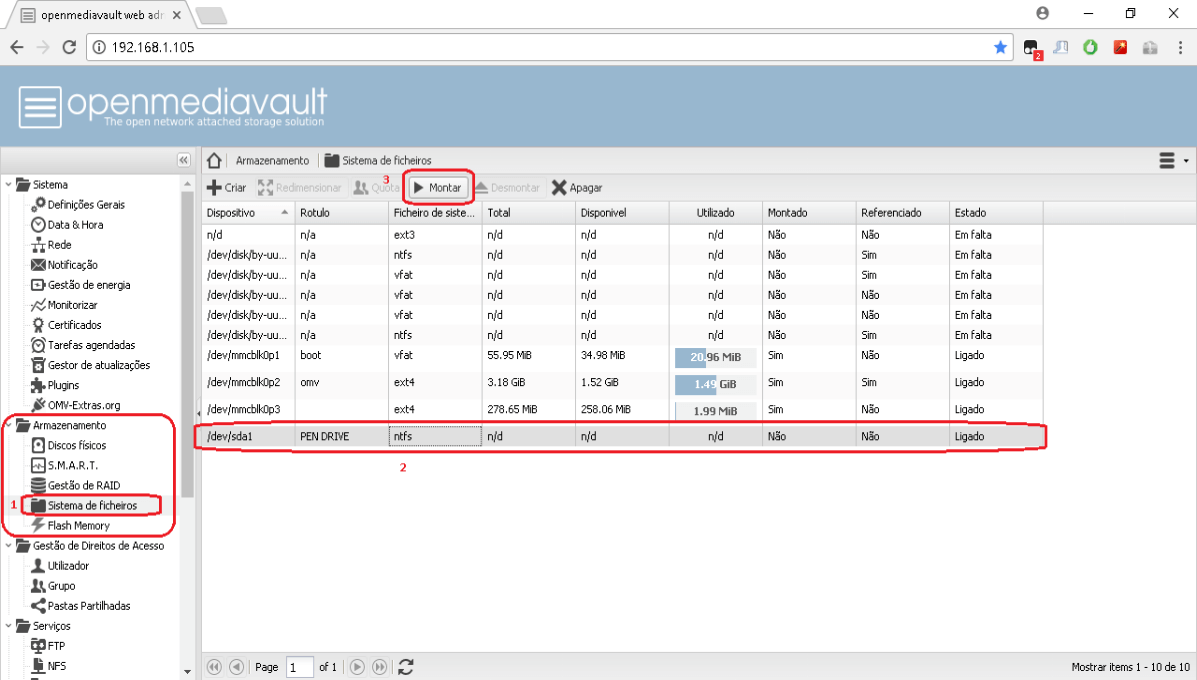 – Agora, assim como mostrado na imagem abaixo no lado esquerdo em Armazenamento, clique em Sistema de ficheiros, agora Atenção! lembra do nome que você deu para o seu dispositivo USB? no meu caso foi PEN DRIVE clique em cima dele e em seguida lá em cima clique em Montar, feito isso aplique as alterações, confirme e siga para o próximo passo: