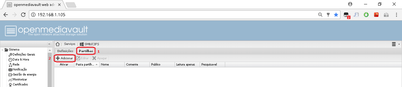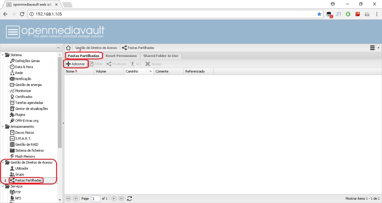 – Agora, assim como mostrado na imagem abaixo no lado inferior esquerdo em Gestão de Direitos de Acesso, clique em Pastas Partilhadas e acima na aba Pastas Partilhadas clique em Adicionar: