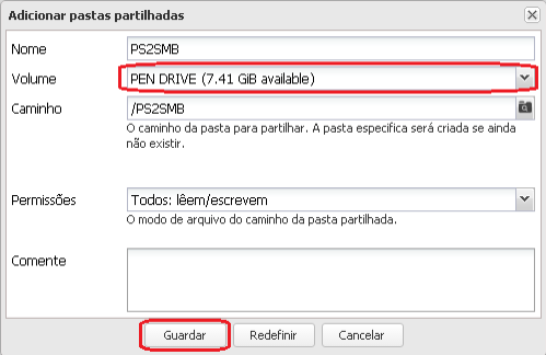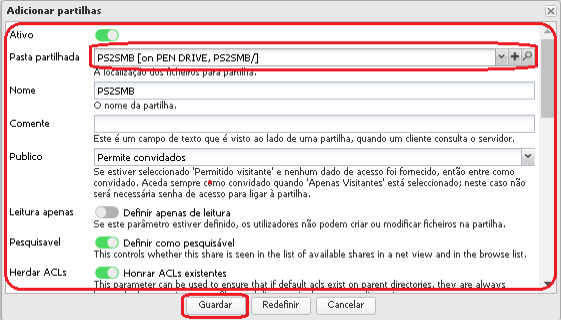 Na janela que se abrirá coloque todas as informações, apenas da parte mostrada na imagem abaixo, exceto em Pasta partilhada que tem que ser a sua, em seguida clique em Guardar, aplique e confirme: