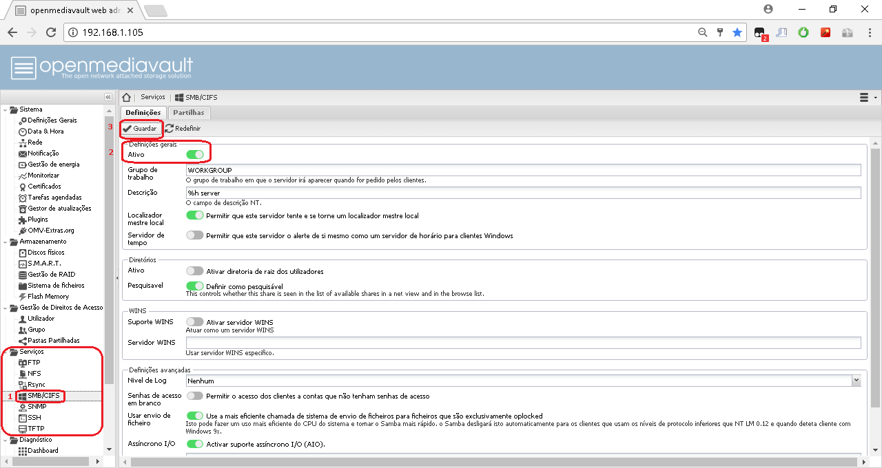 10° – Agora, assim como mostrado na imagem abaixo no lado inferior esquerdo em Serviços, clique em SMB/CIFS e acima em Definições Gerais ative a primeira opção em seguida clique em Guardar, aplique e confirme :