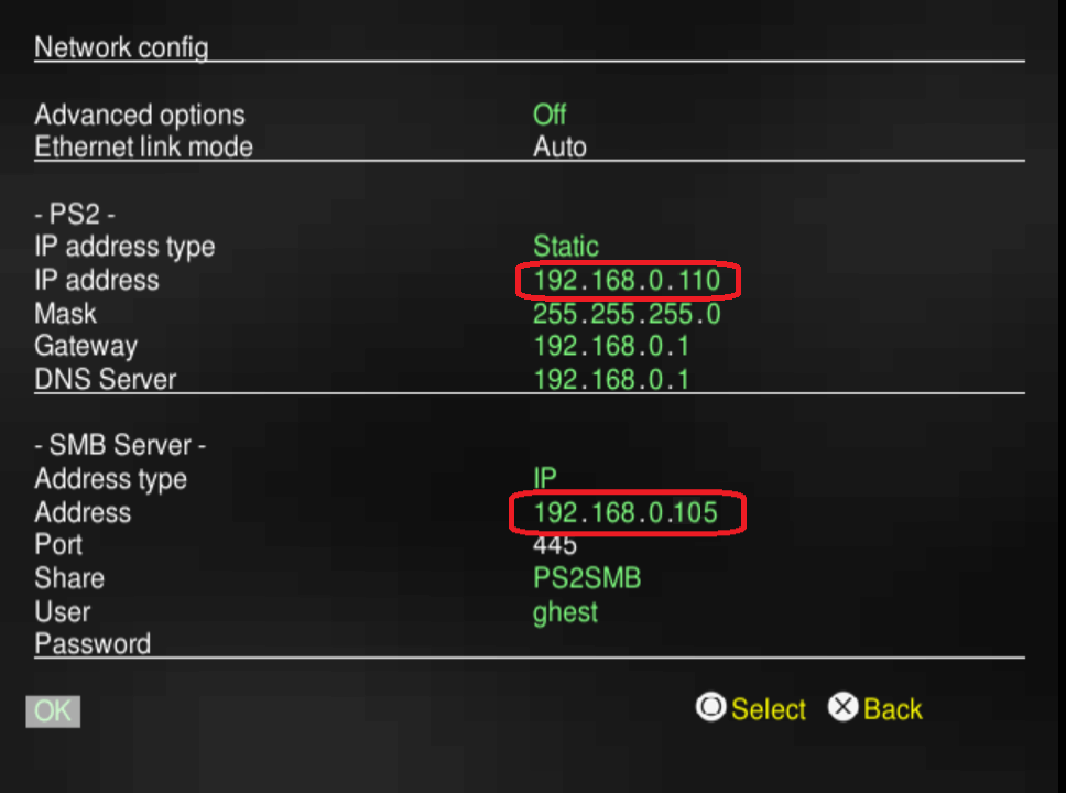11° – Agora desconecte o cabo de rede do roteador (Ou do seu computador) e conecte uma ponta no Playatation 2 e a outra ponta mantenha no Raspberry Pi 3 Model B. Ligue o Playstation 2 e inicie o Open PS2 Loader, em seguida aperte Start para abrir o Menu do Open PS2 Loader, vá para as  Opções de Rede e coloque todas as informações como mostradas na imagem abaixo, exceto o IP do -SMB Server- que vai ser o do seu Raspberry PI e o IP do –PS2- que vai ser sempre um valor acima do SMB Server (Servidor SMB), siga o meu como exemplo abaixo que não tem erro. feito isso dê um OK e em seguida salve as configurações no menu do Open PS2 Loader: