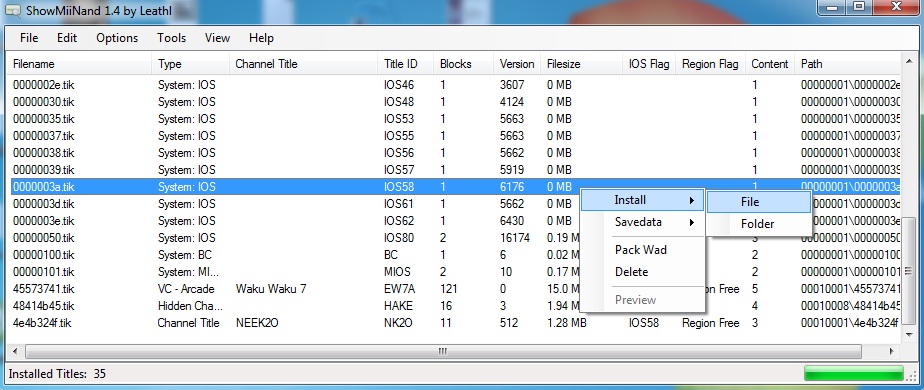 Depois vá em – view – show mii nands espere carregar , escolha ios 58 – aperte o botão direito do mouse – install – file – escolha o wad no seu pc e instale no sd ou usb.