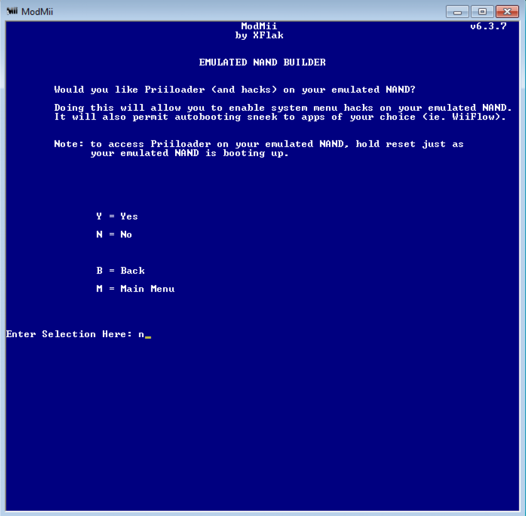 • Priiloader permite ativar ou desativar hack no Wii Menu da NAND emulada, acho desnecessário digite “n”, e de um “Enter”.