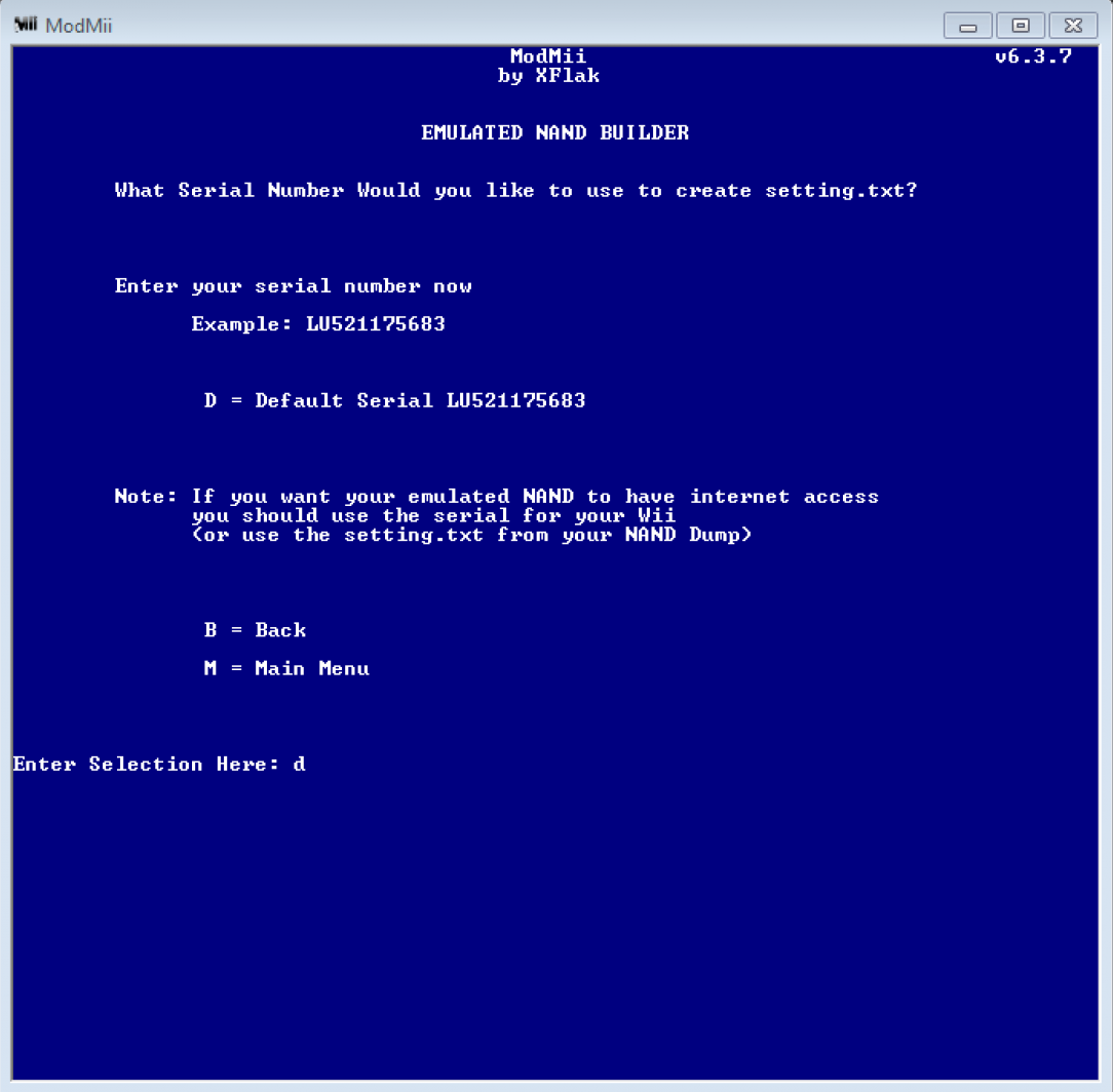 • Agora digite “d” se quiser um serial genérico para a NAND emulada ou digite o serial do seu Nintendo Wii, respeitando letras e números mas sem os colchetes (recomendado usar o serial genérico mesmo)!