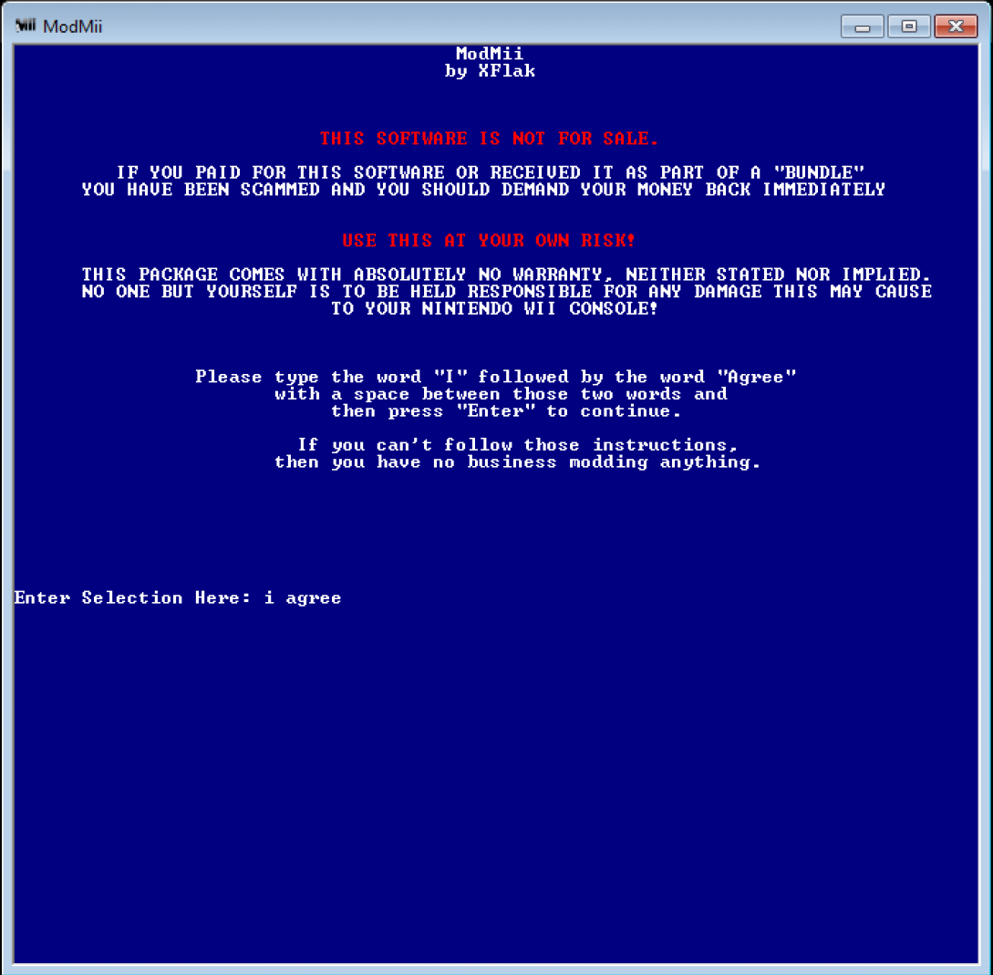 • Quando iniciar o ModMii (inicie o arquivo “ModMii.exe”), digite a frase “i agree” e de um “Enter”:
