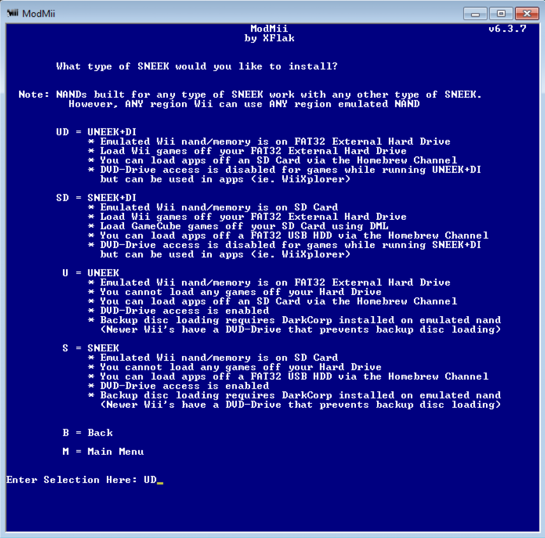 • UNEEK: Emula a NAND no HD Externo ou Pendrive, não permite ler jogos do HD Externo ou Pendrive, permite ler discos originais no drive de DVD do Nintendo Wii ou backups por DVDR (necessário instalar o DARKCORP no SNEEK).