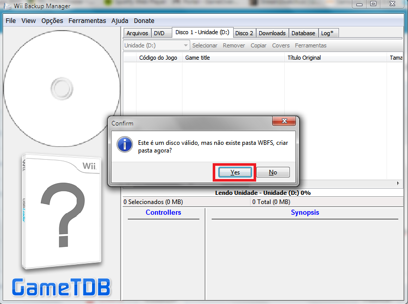 4º – Após selecionar sua unidade, o programa verificará seu HD Externo e se estiver nos formatos FAT32/NTFS informará que é um disco válido e perguntará se deseja criar uma pasta “wbfs” em seu HD (WBFS é o formato para qual os jogos serão convertidos), clique em Yes.