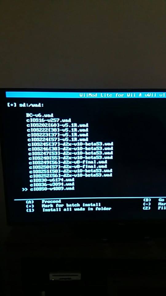 2) Selecione a opção “Wad Manager” e depois “Wii SD Slot“, vai aparecer a imagem abaixo com as “IOS” e “cIOS” no formato WAD , aperte o botão “1” no seu Wiimote para instalar todas de uma vez.