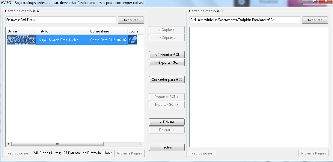 6 – Feito isso, você vai clicar no ícone “< – Importar GCI“, e então selecionar o arquivo .gci, .gcs ou .sav na pasta em que você baixou. Agora é só fechar, colocar o cartão de memória no seu Nintendo Wii, testar e ver se o save está completo como deveria.