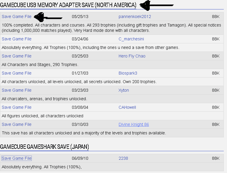 4 – Agora, para aplicar o save, você precisar primeiro baixá-lo. Para isso, recomendo o site “GameFaqs“, ou simplesmente, pesquise no “Google” por “Super Smash Bros. Melee save” e o site da GameFaqs será o primeiro a aparecer. Baixe o save correspondente a sua versão e descrição, que também estarão listadas: