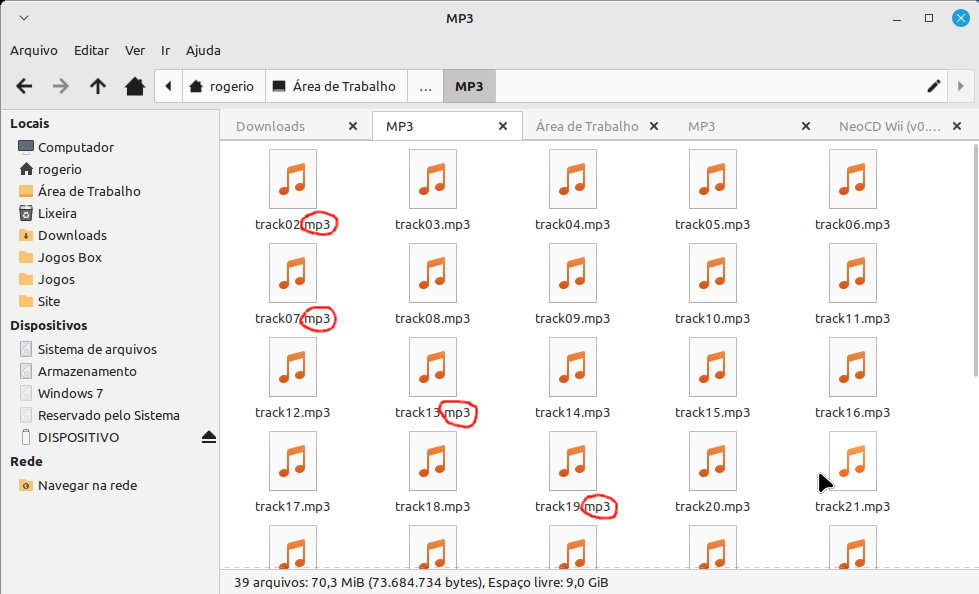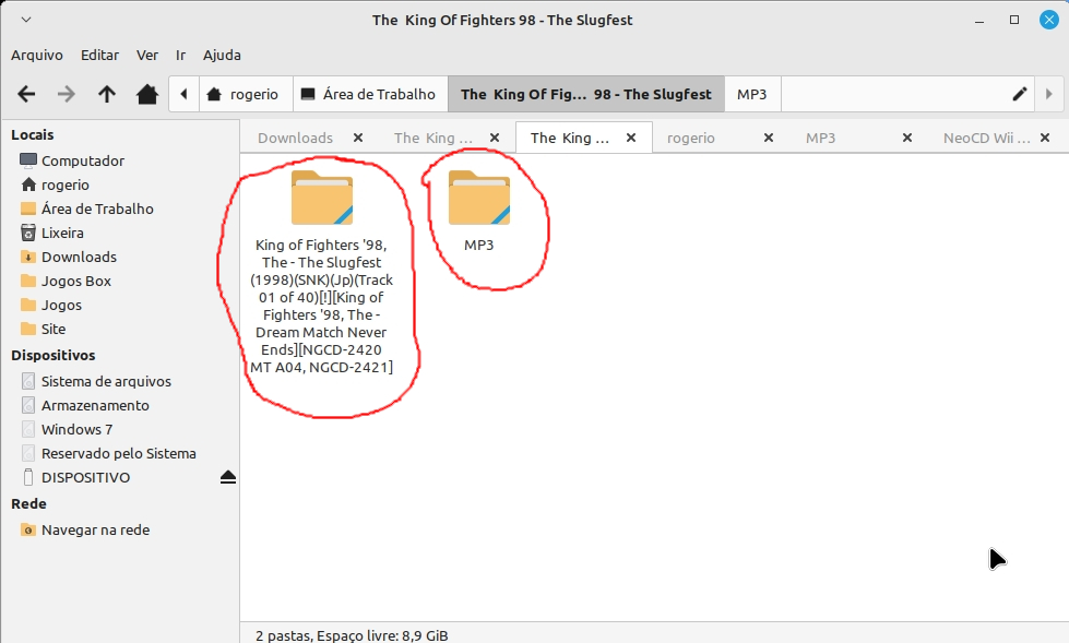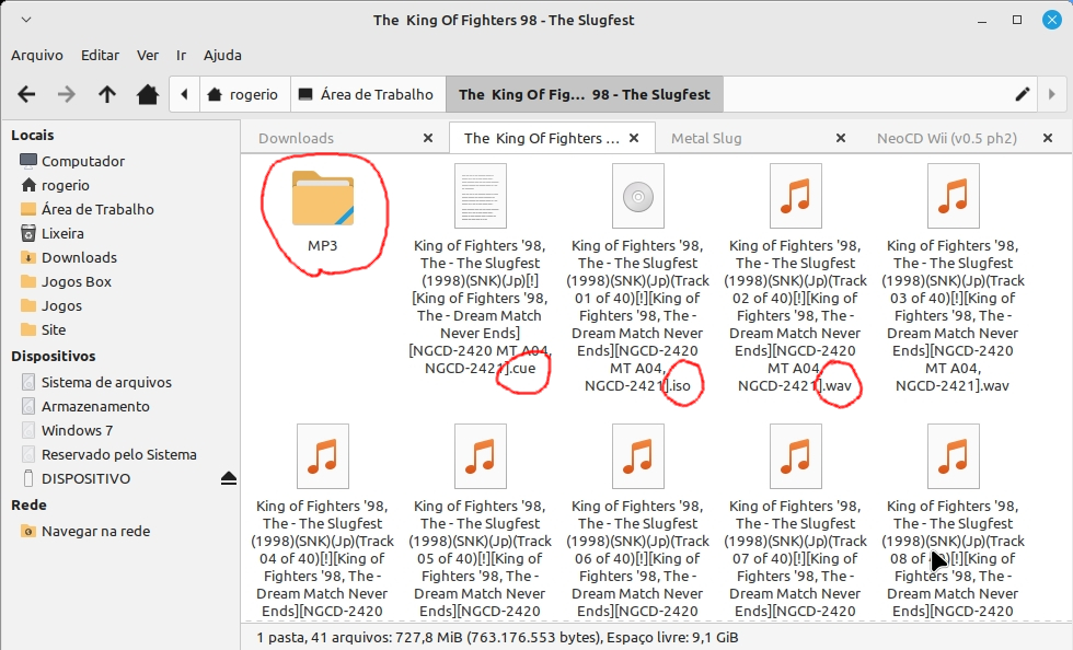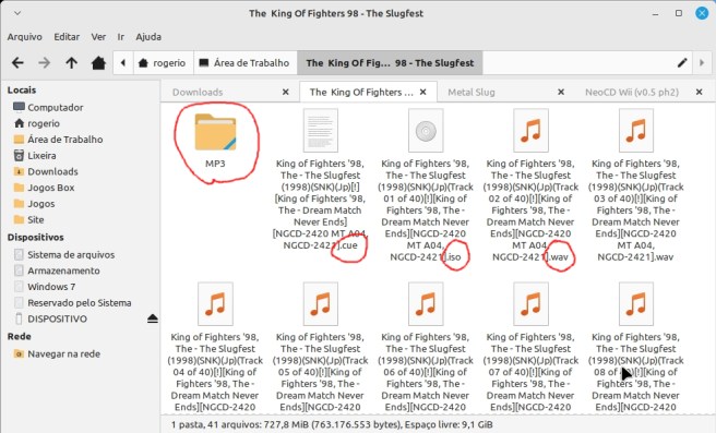 2 –  Após baixar o jogo e descompactar você terá os arquivos “iso e cue” (pode ser bin e cue também) e o restante dos arquivos serão de áudio (podendo ser em diversos formatos, os formatos mais comuns são wav e mp3). Crie uma pasta chamada “MP3” (em letras maiúsculas) dentro da pasta que você extraiu o jogo e mova todos os arquivos de áudio para dentro dela: 2 –  Independente do jogo você terá que renomear os arquivos de áudio (os nomes não deve ter espaços). Os arquivos de áudio que deveram ser renomeados são aqueles que você moveu para dentro da pasta MP3, estes arquivos de áudio devem ser renomeados com a seguinte logica, “track02, track03, track04 até acabar os arquivos de áudio, no caso do jogo “The King Of Fighters 98 – The Slugfest” ele possui 40 arquivos de áudio, então eu terei que renomear “track02 track40” (lembrando que começa renomeando sempre do track02 e não do track01 ), sim é trabalhoso.